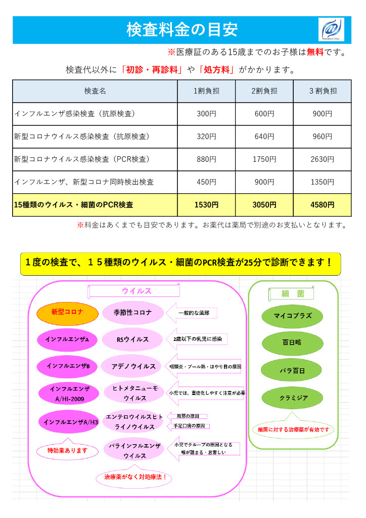 ★検査料金のお知らせ★ 2025/08/21 当医院では、風邪症状(発熱、咳、咽疼痛、倦怠感など)がある際に様々な検査が可能です。 ご希望がある場合は、スタッフにご相談ください。検査料は、概ね以下のとおりになります。